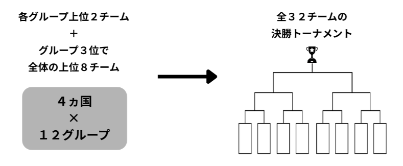- 各グループの3位チームのうち、成績上位の8チームも進出