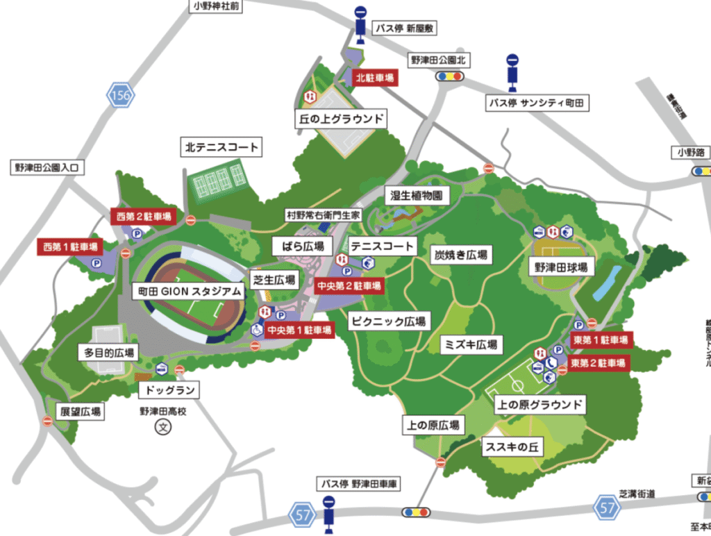町田駅または鶴川駅から、神奈川中央交通バスの「野津田車庫」行きに乗車し、終点で下車します 。