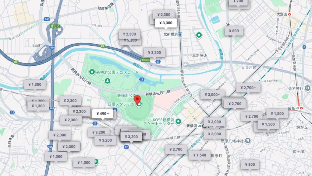 スタジアムまで徒歩15分圏内でかつ、北新横浜駅周辺には同様に24時間最大料金が1000円以下のコインパーキングが多くおすすめのエリアです。