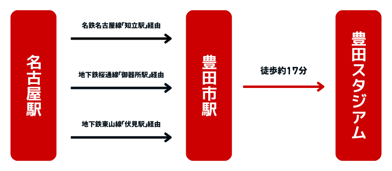 豊田スタジアムへの主なアクセス方法は「電車」「自家用車」の2つです。